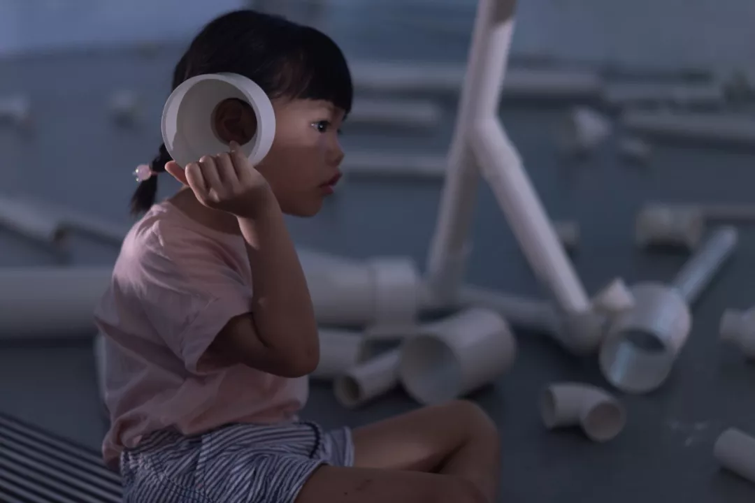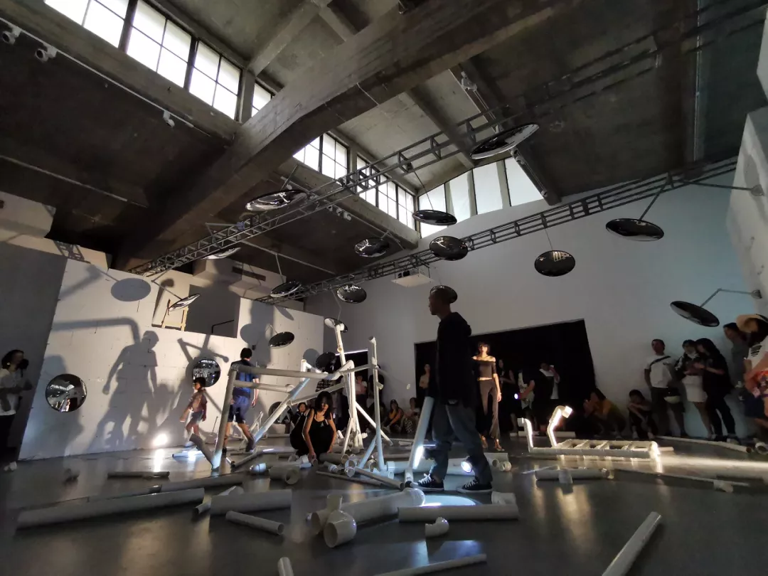 在演出中,六位演员在舞台里走动(两个男演员的脚腕上绑着照亮周围的强光灯),各自说着“你”“我”“我们”“你们”“他们”,偶尔齐声。他们在反光镜中审视自己,拼接、拆解塑料水管的部件,拿一根长杆边敲打边前行,吹奏水管组装成的大号,缓缓呜鸣。这些被喊出的词语、人们的行动和直接取自当下生活里正发挥功用的物件,自然能一起撑开一片意义:人们被随时窥视、建设临时而野生、社群不断分裂、孤独的个体之间渴望能有交织。但在持续了二十分钟的演出里,除去五岁的小朋友能“自得其乐”并保持和周遭观众的疏离,成年参加者仍带着显而易见的紧张。